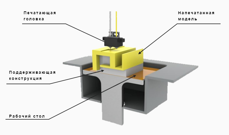 Полимерный материал в виде прутка подается в печатающую головку. В головке материал плавится и выкладывается на рабочую поверхность слой за слоем, при этом головка перемещается в пространстве над столом.
